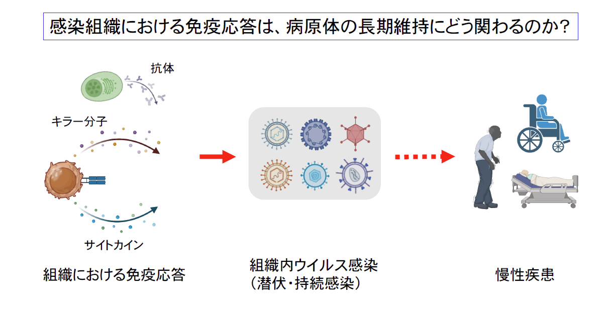 さらに、こうした潜伏感染・持続感染が、神経変性疾患、自己免疫疾患、がんなどの慢性疾患の発症や増悪にどのように関与するのかを明らかにし、病態理解を深めるとともに、新たな治療の手がかりを見出したいと考えている。