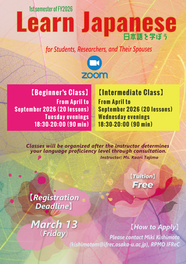 IFReC will hold Japanese language courses (the 1st semester 2026) for reserchers, students and their spouses from overseas at IFReC, RIMD, PRIMe, QIQB, CAMaD and CiNet. Classes will be conducted online (ZOOM Meetings).