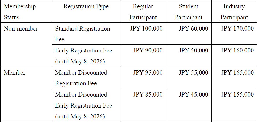 • Please pay the registration fee by credit card at the time of registration. Your registration will not be completed unless payment is made. To receive the early registration discount, payment must be completed by noon (12:00 PM Japan Standard Time) on May 8, 2026.